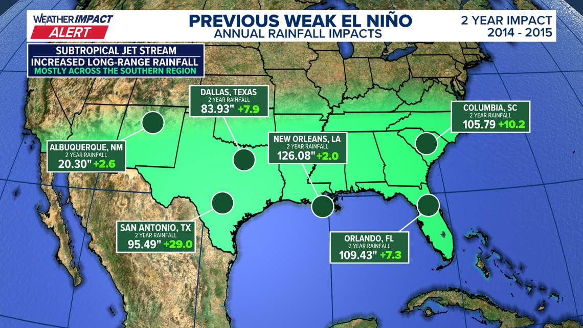 While not all El Niño pattern are the same, here’s an example. Between 2014 and 2015, we shifted into a weak El Niño pattern. This helped enhance rainfall across for several cities across the South.