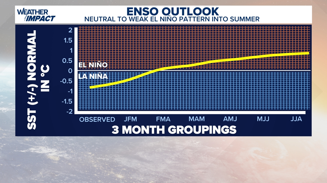The Climate Prediction Center released their ENSO outlook highlighting the likelihood of a gradual shift. It shows the overall pattern moving from a weak La Niña to a weak El Niño by the end of summer.