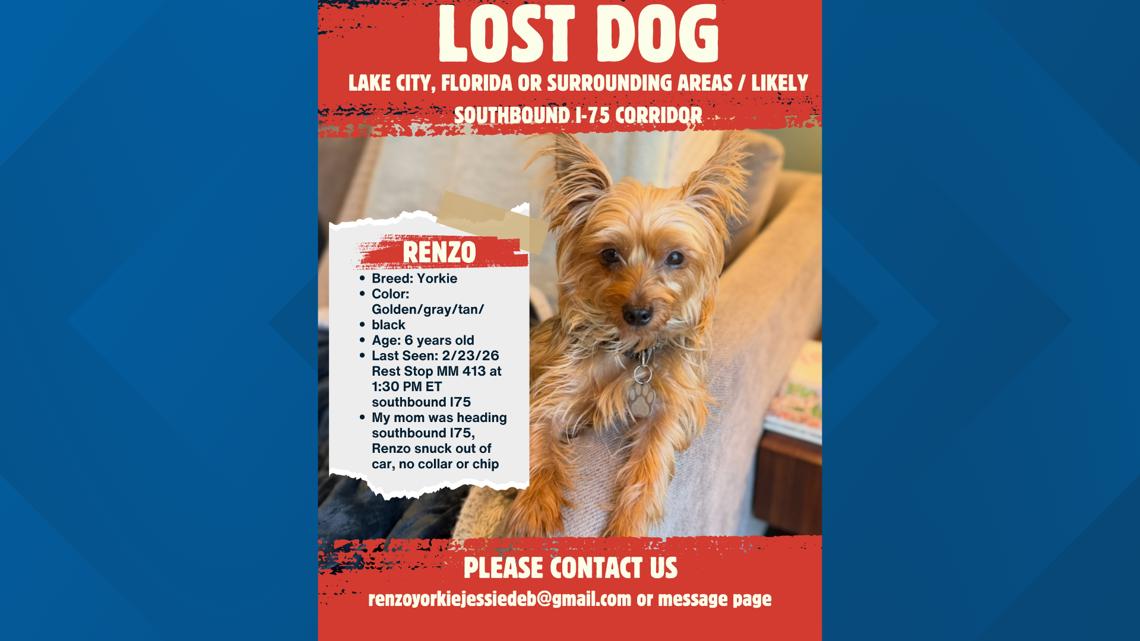 A Lake City rest stop ends in heartbreak. Now, a Michigan family is asking for help in finding their missing Yorkie, Renzo.