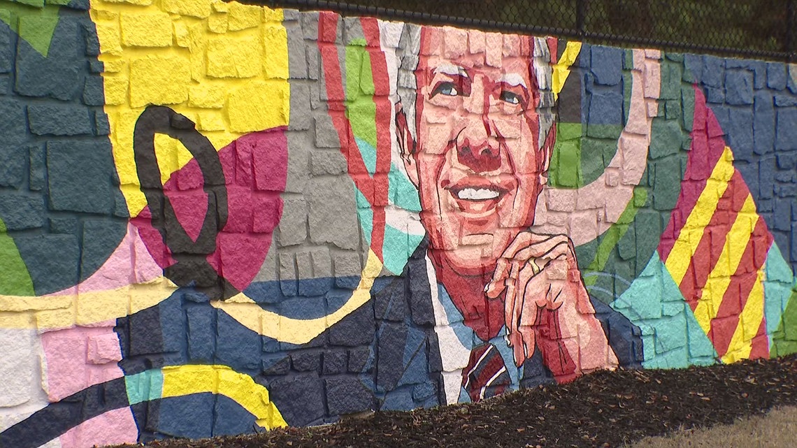 A few miles South on Jimmy Carter Boulevard, a namesake mural greets drivers. The work of art was recently completed to celebrate President Carter’s 100th birthday – a radiant rainbow in the middle of an industrial landscape.
