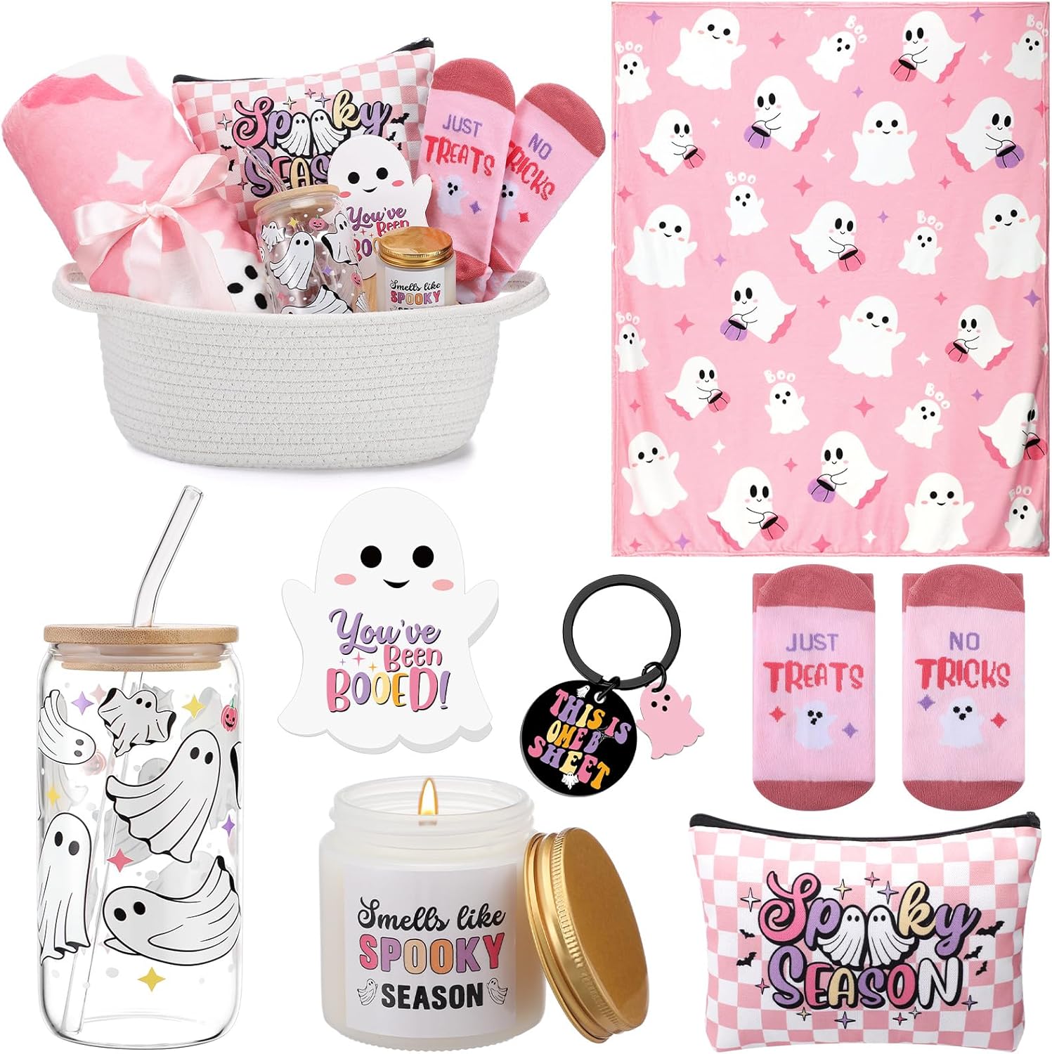 Transform your Halloween experience with this thoughtfully curated gift basket, featuring eight unique items that elevate the spooky spirit. The ghost-themed glass with lid and straw offers stylish sipping, while the Halloween-themed makeup bag organizes your essentials with atmosphere. Enhance your home ambiance with the scented candle, and share the joy with a charming ghost-shaped greeting card. This set is the ultimate festive indulgence or perfect gift choice for loved ones.