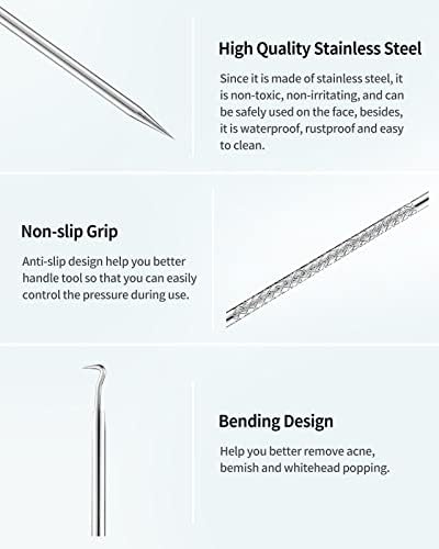 【Ergonomically Designed Appearance】-The blackhead remover tools is built with an anti-skid handle, which can help you better control the pressure during use, and ensure accuracy use to avoid damage to the skin, besides, the bending design helps remove stubborn blackheads and acne with no pain.