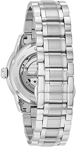 Self-winding mechanical timepiece with 21 jewel movement visible through double on dial aperture and exhibition case back. Powered by the wearer’s own movement, with no battery required. In stainless steel with domed metalized crystal, black patterned dial, luminous hands, 24 hour sub dial, small sweep, screw-back case, double-press deployant double and water resistance to 30 m.