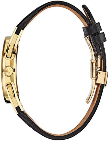 Black (Transparent Center) dial enhanced by luminous yellow gold-tone hands. Yellow Gold-tone stainless steel case with a black leather band. Quartz movement. 30 meters / 100 feet water resistance. Fixed bezel. Scratch Resistant Sapphire crystal. Transparent caseback. Deployment clasp. Case size 44 mm x 12 mm. Band 21 mm x long. Bulova 97A143 CURV Watch.
