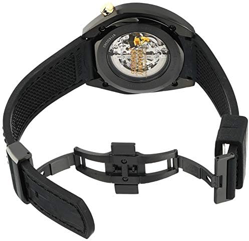 The black IP stainless steel case with features a gold-tone guitar tuning peg-shaped crown at the four o’clock position.