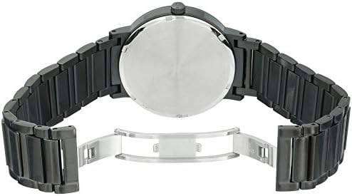 Three-hand date feature, metalized edge-to-edge curved crystal, screw-back case, black ip stainless steel bracelet with deployant closure, and water resistance to 30 meters