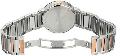 Domed mineral glass, metalized edge-to-edge crystal, screw-back case, stainless steel and rose gold-tone bracelet with deployant closure, and water resistance to 30 meters