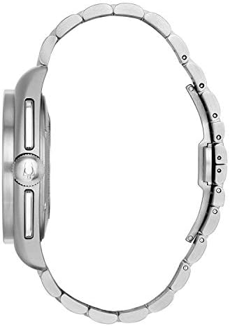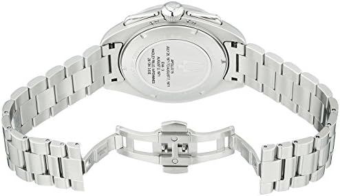 - Black dial features white-tone hands and hour markers, three subdials, date display window, minute track, and Bulova detailing.