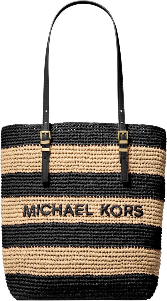 Our Quinn tote bag feels destination-ready in hand-crocheted straw with colorful stripes and leather top handles to match.…