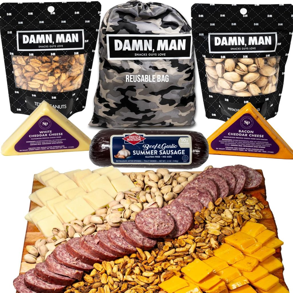 The Wisconsin Cheeseman Meat and Cheese Combo – Featuring Italian, Original and Garlic Summer Sausages, Colby, Brick, Sharp Cheddar, and Monterey Charcuterie Boards, Charcuterie Gift Basket Set