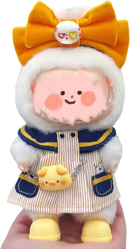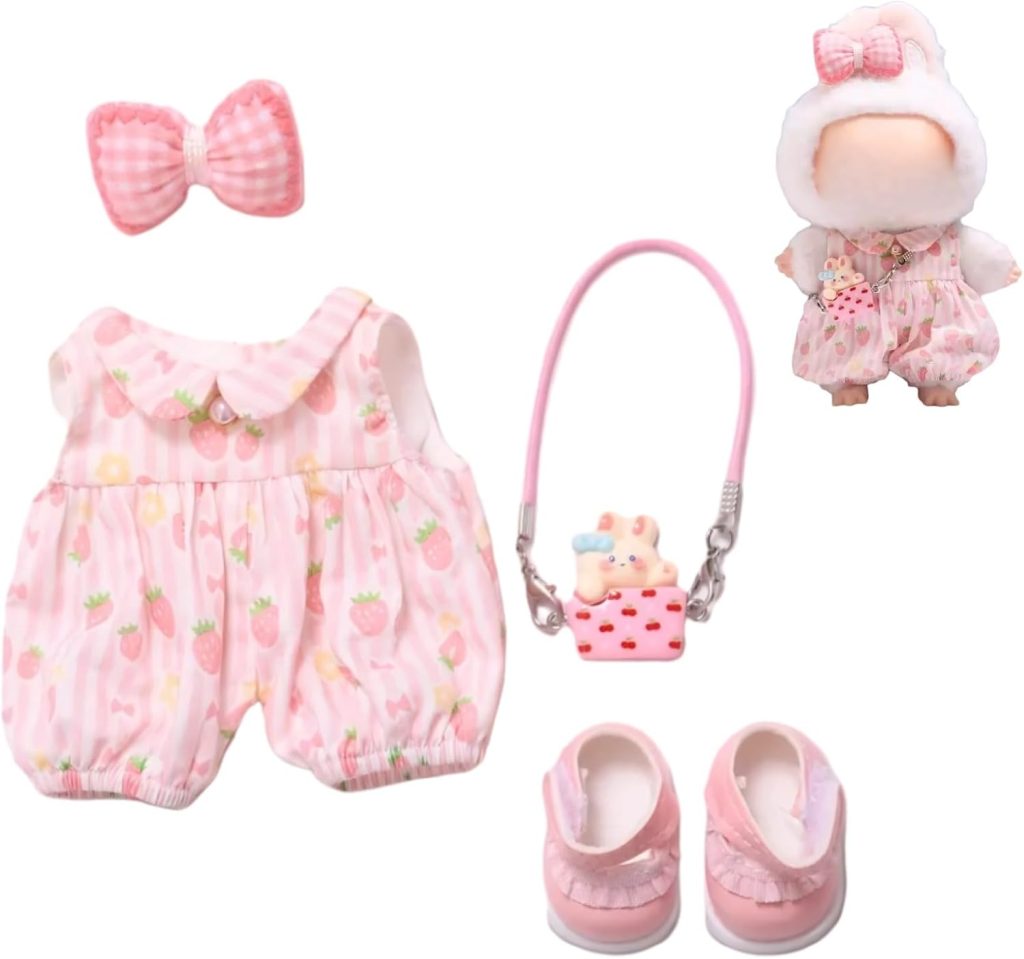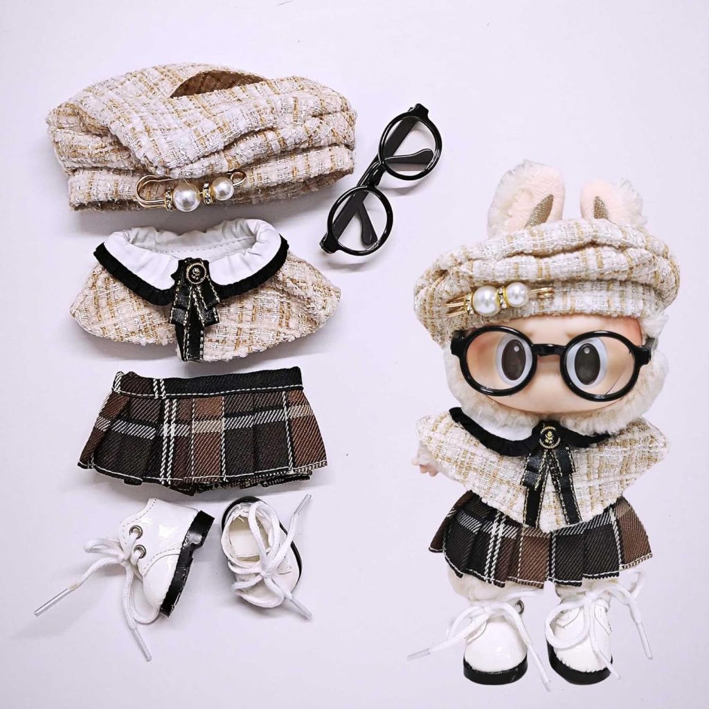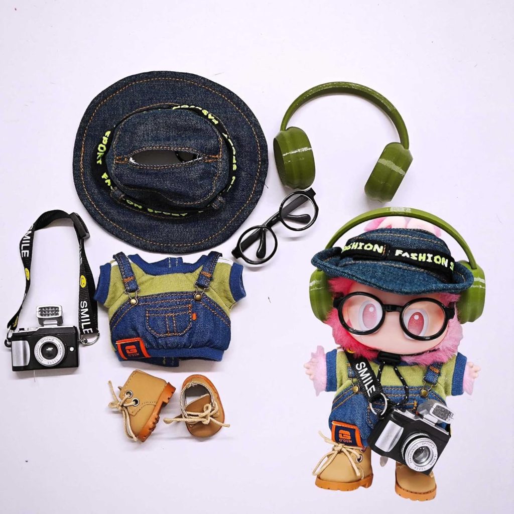 Cowboy Outfit for LABUBU Dolls – 4-Piece Western Set with Denim Hat, Plaid Scarf, One-Piece Jumpsuit & Brown Boots – Doll Clothes Accessories Only