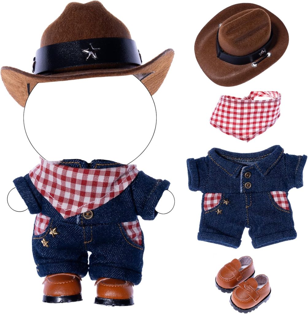 Cowboy Outfit for 17cm Dolls – 4-Piece Western Set with Denim Hat, Plaid Scarf, One-Piece Jumpsuit & Brown…