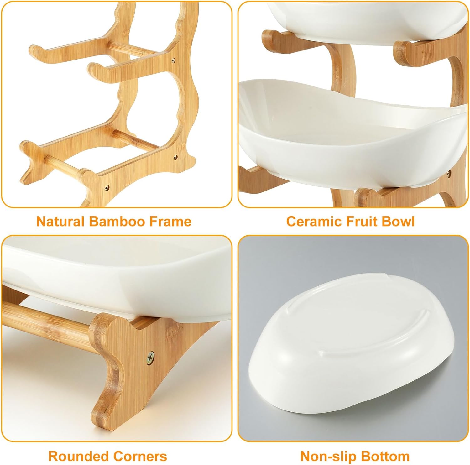 Stable and Reusable: This ceramic fruit bowl stand is made by thickened bamboo and wood with strong weight capacity. And the stand features bowl slot design for holding the fruit bowl, not easy to slip or shake. High temperature firing, bright color, BPA free, food grade safety. Also, the ceramic fruit bowl is effortless to clean that is reusable. With smooth bottom, it will not scratch the desktop.