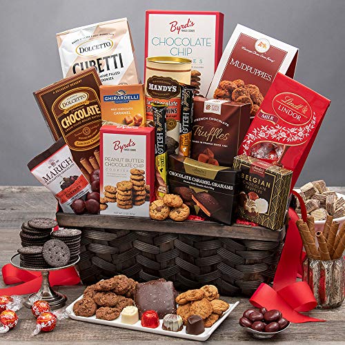 Gourmet treats include French chocolate truffles (3.5 oz), Belgian chocolates (1.76 oz), chocolate chip cookies (4 oz), chocolate and caramel covered grahams (2.6 oz), dark chocolate cookie thins (4.6 oz),