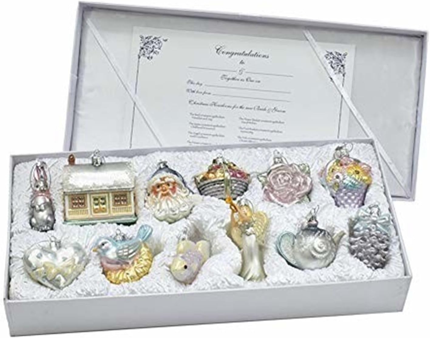 Christmas Decorations And Festive Ornaments – Bride’s Glass Tree Box (Set of 12) This Bride’s Glass Tree Box is a gorgeous addition to any holiday décor or Christmas tree. This set features a bunny, a house, Santa Claus, a basket of fruits, a rose, a basket of flowers, a heart, a bird in nest, a fish, an angel playing the trumpet, a teapot, and an acorn. This set is the perfect gift for newlyweds. No better way to start your first Christmas off as a couple than with this set of beautiful ornaments! Your tree will never look better! Key Product Features – Part of the – Made of glass and paint/mica – Perfect gift for newlyweds! – Comes in a gift box Holiday Décor For Xmas