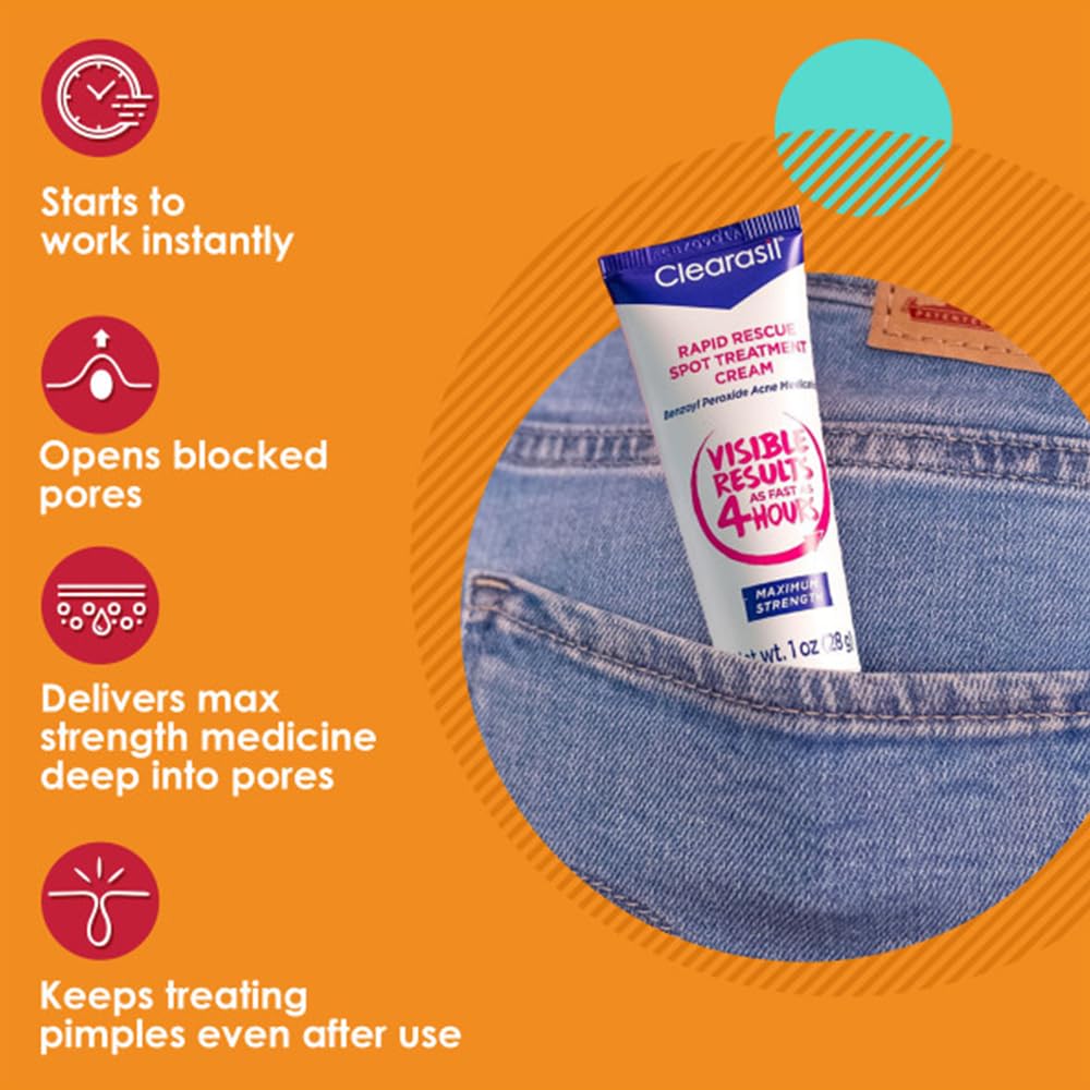 Dermatologist-tested Clearasil Ultra Rapid Action Vanishing Treatment Cream treats problem areas fast, visibly reducing redness and spot size in as little as four hours. Scientifically formulated with maximum-strength medication, Rapid Action Vanishing Treatment Cream penetrates your pores to fight breakouts. Contains Benzoyl Peroxide 10% Acne Medication