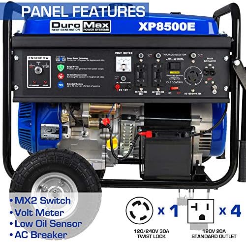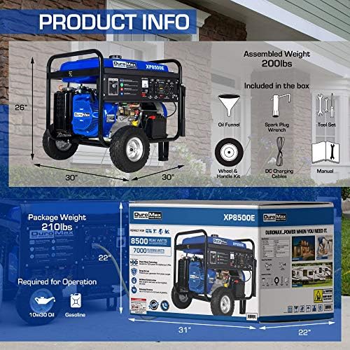 Your purchase includes One DuroMax XP8500E 8500 watt 16-Hp Gas generator with Electric Start, One oil funnel, One spark plug wrench, tools set, wheels and handle kit, DC charging cables and owner’s manual