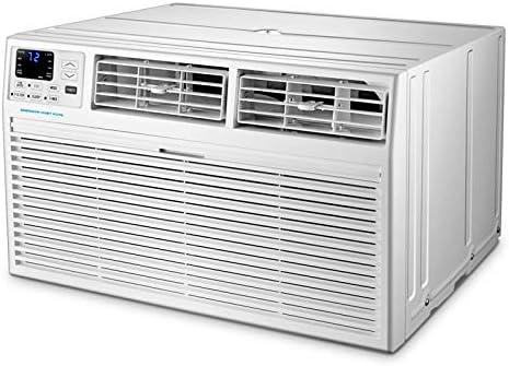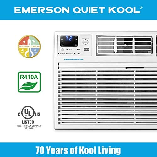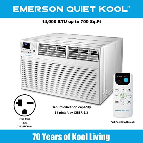 Designed for a room up to 700 square feet, the Emerson Quiet Kool 4-in-1 air conditioner gives you flexible home comfort options. Not only will this unit cool the room with 14, 000 BTUs of power, it can also provide 10, 600 BTUs of supplemental heating for cool, brisk nights. On top of that, it can also function as a fan for air circulation and a dehumidifier for lowering humidity in the room. This model is designed for through-the-wall installation and is not designed for standard window installation. It will fit most existing wall sleeves (including our competitors) and includes a decorative interior trim kit. This unit also requires a special 230-volt/20-amp electrical outlet and will not operate with a standard 115V household electrical outlet. For peace of mind, you get our 1-2-5 years : 1 year labor, 2 years parts and 5 years compressor. Emerson Quiet Kool air conditioners are a great way to stay comfortable.