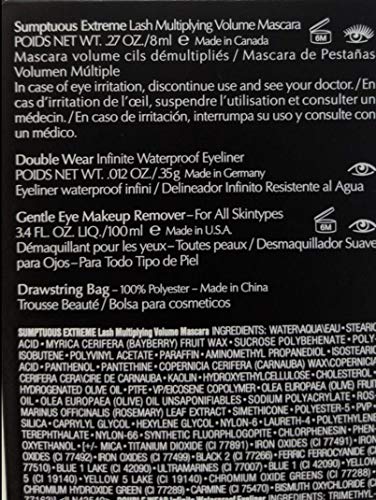 Extreme Lashes Set Includes Sumptuous Extreme Lash Multiplying Volume Mascara in Extreme Black, 8ml Lashes seem to multiply, magnify, grow to extremes. Three different high-volume fibers create audacious, false-lash effects. Lustrous color leaves eyes looking brighter, wider, more seductive than ever. Double Wear Infinite Waterproof Eyeliner in Kohl Noir .01 oz./.35g Draw the line. Crave-worthy color that lasts all day and night—up to 24 hours. From precision definition to a sultry smolder, the possibilities are endless. Includes a soft smudge tip and built-in sharpener. For a smudged effect, blend before it sets. Waterproof. Smudge-, sweat-, heat- and humidity-resistant. Gentle Eye Makeup Remover, 3.4 oz./100ml This gentle, lightweight formula works quickly and gently to remove powder eye-shadow and other eye makeup. Sweeps away without leaving any oily residue, so you can reapply eye makeup immediately after use. Oil-free formula won’t damage delicate skin. Remember: Never go to bed with makeup on. Clean skin is healthy skin. Eye Print Drawstring Bag
