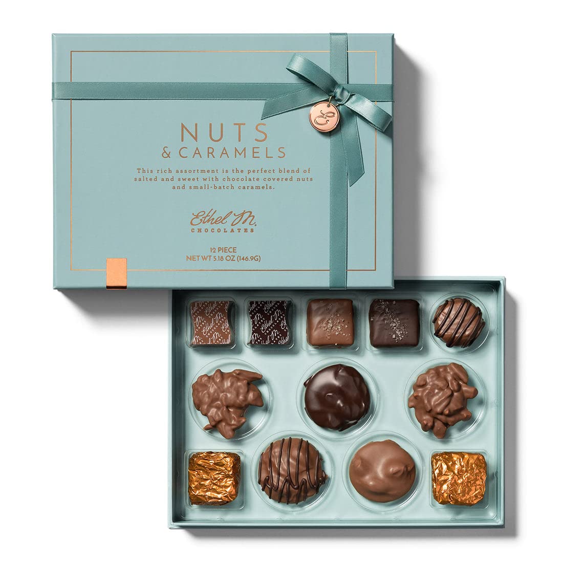 PREMIUM CHOCOLATE ASSORTMENT BOX Each copper gift basket includes a premium chocolate assortment. Enjoy Ethel M’s Classic Collection containing 16 popular chocolate pieces, presented in a signature gold Ethel M Chocolates box.