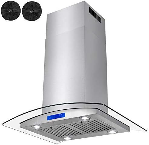 Elegant, stylish and modern-contemporary. This FIREBIRD RH0357 30 in. stainless steel island mounted range hood offers a unique addition to your kitchen. The curved glass contours the stainless steel with magnificent precision. The touch panel can be easily used. Change the fan settings up to three-speeds at 343 CFM. LED light emit bright beautiful lighting for evening dinners. Two baffle filters help keep oil particles trapped and keeping your kitchen fresh. Worried about noise level? Don’t be, this range hood has a noise level of less than 65db which makes it easy to hear others while cooking. Keeping track of time can be done in a breeze with a 60-minute timer with clock. For ductless recirculating installation, a carbon filter kit is included (CF0011).