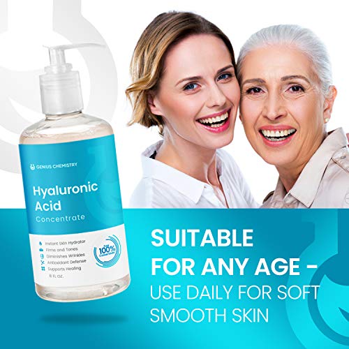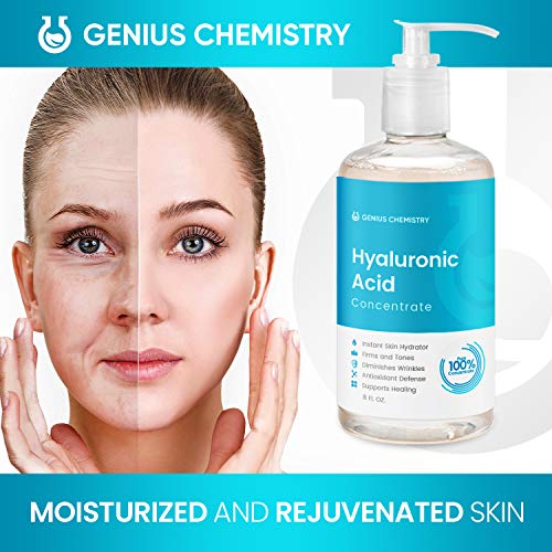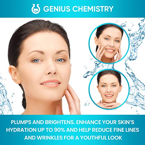 FIGHT AGAINST AGING WITH THE BEST HYALURONIC ACID SERUM AVAILABLE TODAY! Genius Chemistry Hyaluronic acid moisturizer can carry up to 1,000 times its weight in water making it a phenomenal face serum for anti-aging concerns. Dehydrated skin can worsen dark circles & make fine lines appear more prominent. Increased moisture leads to smoother firmer looking skin. Our hyaluronic acid serum for skin, when applied 1-2 times daily, replenishes the moisture our skin loses naturally because of aging