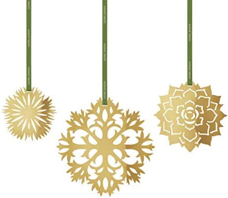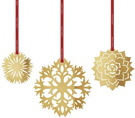 Bringing the frosty beauty of an ice flower into your home at Christmas, this set of three 18 karat gold plated hanging ornaments is sure to make an eye-catching statement hung on a tree, a branch or in the window. Intricate cut outs based on paper flowers create delicate patterns – different on each one – that catch the light as the decorations turn on their ribbons adding a captivating sense of movement.
