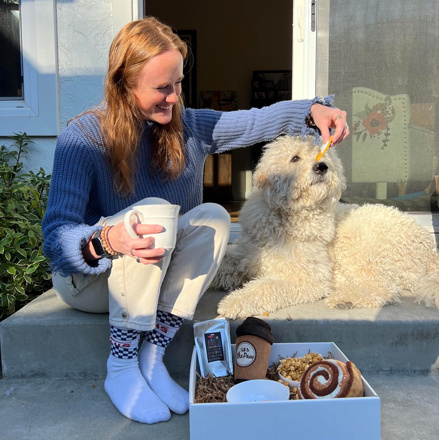Matching gift baskets for dog lovers and their fluffy buddies – curated gifts all about sharing fun, play, and delicious food and bevs.