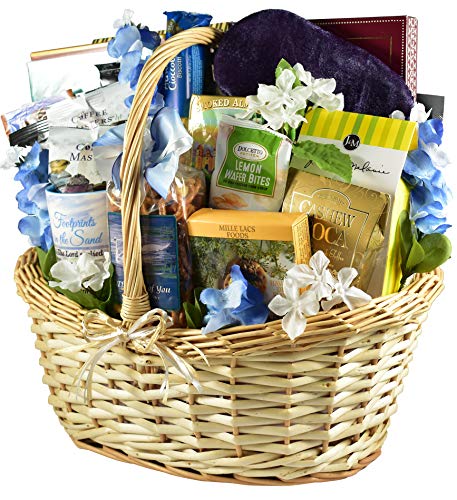 This wonderful collection of gifts is adorned with gorgeous life-like silk flowers and ivy and then topped off with a large beautiful bow. Anyone will love this gift and appreciate your thoughtfulness, but most importantly it will bring some much needed comfort.