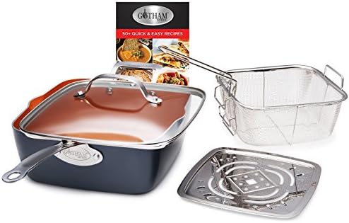 Gotham Steel 20 Piece All in One Kitchen Cookware + Bakeware Set with Nonstick Durable Ceramic Copper Coating Includes Skillets, Stock Pots, Deep Square Fry Basket, Cookie Sheet and Baking PansComplete kitchen in a box includes a complete suite of fry pans, stock pots, sauce pans, bakeware pans, steamers and more (see below for complete list of contents)Award winning Ti-Cerama coating, derived from ceramic and reinforced with titanium ensures the ultimate release — everything just slides right off the pan, no need for oil or butterUltra-durable, scratch-proof & metal utensil safePlease note, the components of the set may be individually wrapped and placed in a larger box. Lightweight design makes for a comfortable cooking experienceOven safe up to 500° F, The pots and pans are suitable for all stovetops, except inductionDishwasher safe Makes for effortless clean upStay cool handles are cool to the touchHealthy & toxin free this cookware set is 100% free of PFOA, PFOS, PTFE, lead & cadmium for an , healthy experience10-year Gotham Steel Cookware is built for years of use and backed by a 10 year limited Contents this set includes 8. 5″ fry pan, 10. 25″ skillet with tempered glass lid, 1. 5 quart sauce pan with tempered glass lid, 2. 5 quart sauce pan with lid, 5 quart stock pot with lid, stainless steel steamer rack, 9. 5″ square shallow pan, 9. 5 deep square casserole pan with tempered glass lid, stainless steel frying basket, steamer insert, 12 x 17 XL cookie sheet, 9. 5 x 9. 5 square baking pan, loaf pan, 9. 5 round baking pan, 12 cup standard sized muffin pan