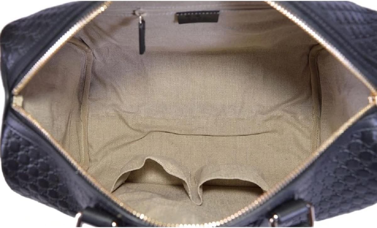 Travel in style with the Gucci Microguccissima Black Leather Boston Bag. This bag features the GG embossed logo pattern and gold-toned hardware. This large crossbody bags opens to a large amount of space that includes an interior zip pocket and smart phone pocket. The sleek design makes this the perfect bag for business and travel!