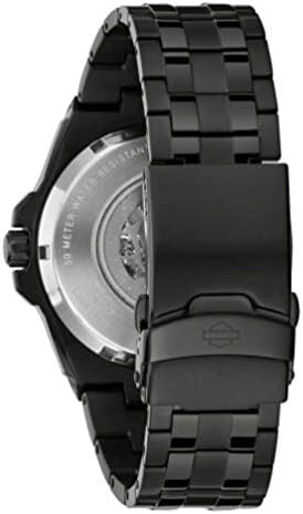 Harley-Davidson Men’s Bulova Watch, 78A128. For Him!Skeleton automatic movement with open Bar & Shield logo showcasing the rhythmic movement of the balance wheel – the “heartbeat” of the watch. 21 Jewel automatic movement with a 40-hour power reserve. Exhibition case back, crown protector, signature sweep second hand and luminous hands. Black IP case and bracelet with applied gold-tone IP bolts, markers, hands and logo. Sport fold over clasp. Water resistant up to 50m/165ft.Built to endure, whatever the challenge, Harley-Davidson Timepieces by Bulova reflect the uncompromising pursuit of excellence of two of America’s most honored companies. Founded in Milwaukee in 1903, Harley-Davidson continues to produce the world’s most acclaimed motorcycles. Bulova, established in New York City in 1875, enjoys international renown for timepieces of superior quality and precision. Drawing on more than 200 years of exceptional craftsmanship, these proud American companies have joined forces to create a collection of watches with the strength, style and durability worthy of both great names.Face Color: Gray, Band Type: Strap, Band Material: Stainless Steel, Case: Stainless Steel, Dial Type: Analogue, Construction: 50m/165 ft (5 ATM). 2 year warranty through Bulova.