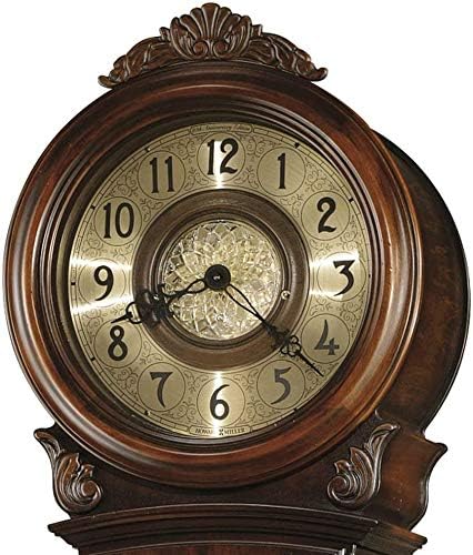 This beautiful floor clock has a sturdy wood frame with adjustable levelers to provide stability and a hinged top door with a removable crown to relieve stress in a busy household. The dial has satin black Arabic numerals, crystal-cut center disk with a wood ring, and a circular spun brass-tone chapter ring.