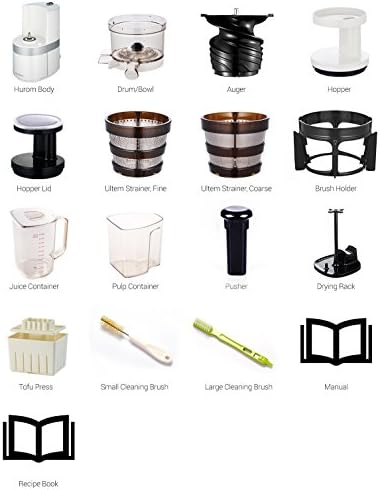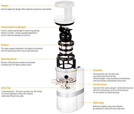 The HK Slow Juicer is a revolutionary juice extractor that uses Hurom’s patented Slow Squeezing Technology (SST) to gently, quietly, and quickly squeeze a vast variety of ingredients into delicious, vibrant fruit and green juices and vegan nut milks. SST retains heat-sensitive phytonutrients and delicate enzymes essential to health that can be otherwise compromised by the eviscerating effect of high speed blades in traditional juicers and blenders. Our blade-less screw-like auger uses gravity to pull in ingredients into its grooves and our powerful energy efficient AC induction motor spins it at only 43 rotations per minute resulting in a mortar and pestle action that works by masticating and cold-pressing raw foods. Minimizes oxidation, aeration, and separation on the cellular level of ingredients and results in gorgeous, smooth, delicious, richer-color juice full of water soluble fiber that delivers 4x the absorption rate and up to 60% more nutrients than eating fruits & vegetables.