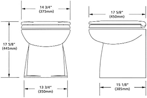 Top-of-the-line electric toilet, the deluxe flush, is designed to conceal the flush pump, wiring and plumbing, while featuring a full-size household seat. It’s available in 14″ or 17″ models, both with the choice of a straight or slanted back. The straight back version fits snugly against a vertical bulkhead, while the slant back version mounts against a slope or in a corner, giving it a smaller footprint.