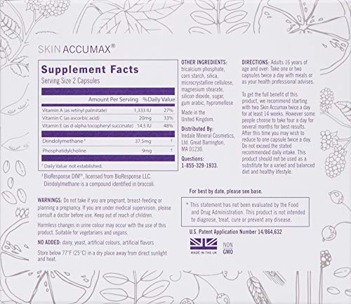 Skin Accumax is the natural solution for blemish-prone skin. Beautiful skin is well-nourished skin, and now it’s easy to provide the precise nutrients your complexion needs to flourish from the inside out. 14 Week Reset includes: 2 Skin Accumax Triple Packs (180ct/each), 1 Skin Accumax Single Pack (60ct), 1 Skin Omegas Sample Pack (20ct) and 1 Limited edition jane iredale supplements tin. Our patented Skin Accumax formula promotes clear, problem-free skin, suits all skin types but especially beneficial for apneic and problem skin, improves skin quality throughout the body, features a synergistic blend of Vitamins A, C, E and diindolylmethane (DIM), contains no harsh chemicals, optimal absorption from Bio-Identical Ingredients, ingredients sourced in the UK and Europe, never tested on animals, certified current Good Manufacturing Practices (camp’s), non GMO, 100% free of gluten, soy and synthetic flavorings, non- irradiated, conforms to Pesticide and Heavy Metal Guidelines and is suitable for vegetarians and vegans. Amount Per Serving is 1,333 IU
