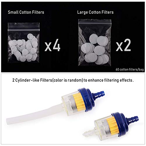 Also includes 360 cotton filters (6 bags × 60 filters per bag) (240 small and 120 large ones), an air hose for diamond filter, 2 cylinder-like plastic oil filters and a power cable.