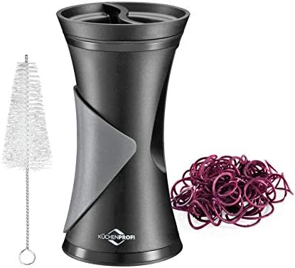 Founded in Solingen Germany by Arthur Schmitz in 1923, the story of Küchenprofi is one of diligence, innovation and refinement. Early on, Küchenprofi realized the need for affordable functional tools that make the kitchen more efficient and more enjoyable. The name of Küchenprofi reflects strength, quality and functionality demanded by chefs around the world. Kuchenprofi made for professionals, now available to anyone passionate about cooking. The spiral slicer is better than the rest. It cuts extra long spirals with little effort. It will cut 1/8″ (3 mm) For salads and 13/64″ (5 mm) For cooked vegetables. Simply insert and twist your vegetables. Protective finger guard included. Made of stainless steel and plastic, Dishwasher safe. Includes bonus cleaning brush.