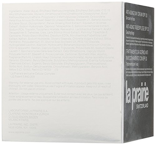 La Prairie Anti Aging Day Cream SPF 30 A Cellular Protection Complex. It protects skin from UVA and UVB rays while fighting against other environmental stressors. Boosts collagen production to prevent lines and wrinkles by stimulating cell turnove