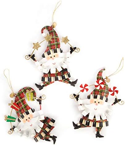 Make your Christmas tree merry and bright with our set of three Party Santa Ornaments. These festive Santas are made of tin and decorated on the front with hand-painted red and green tartan with Courtly Stripe accents. Each Santa has dangling legs and holds a garland of either peppermints, stars or packages.