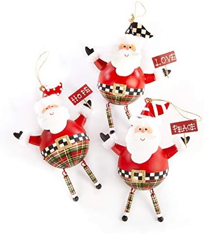 Make your Christmas tree merry and bright with our set of three Peace Love Hope Santa Ornaments. These festive Santas are made of tin and decorated on the front with hand-painted red and green tartan with Courtly Check accents. Each Santa also has dangling legs that swing and holds a sign proclaiming the sentiments of the season.