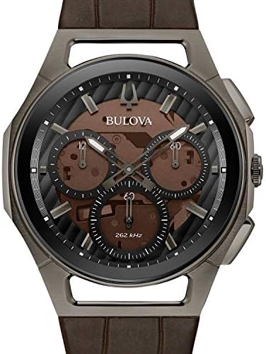 For over 140 years, Bulova has built exceptional timepieces for an array of styles. Now, Bulova has fused these same great styles with an innovative look that is designed to optimize comfort. Watches in the Bulova CURV collection feature the world’s first fully curved case and movement to allow the timepiece to conform more comfortably to your wrist. This CURV timepiece from Bulova sports a curved, 44mm grey ion-plated stainless steel case with anti-reflective curved sapphire crystal and an exhibition caseback with screw-back case. The transparent brown dial includes a small sweep, chronograph sub-dials, coordinating grey accents, and luminous hands. Completing the look is a brown leather strap with an alligator grain texture that comfortably secures with a double-press deployant closure. This Bulova CURV watch is not only a comfortable and classy looking accessory, but its high-performance quartz technology with a 262 kHz vibrational frequency provides you with incredible precision to keep you on time to your most important engagements.