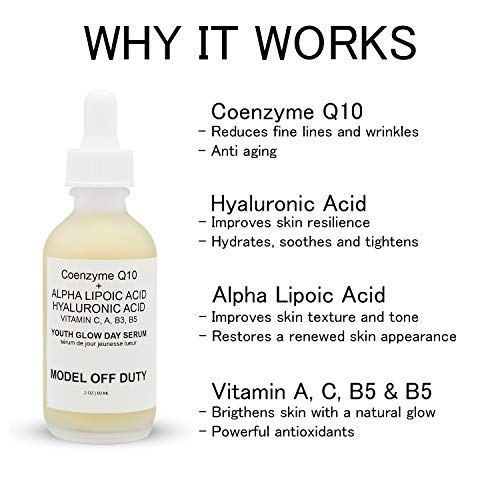 YOUTH GLOW DAY SERUM – DMAE diminishes issues with skin sagging. The result is smoother, firmer, clearer, and younger looking skin. Hyaluronic acid holds water and helps keep it hydrated and plump. Aloe Vera – Its natural astringent and emollient properties will help cleanse and reduce pore size. Alpha Lipoic Acid reduce swelling and puffiness in the face, improving visible skin texture and tone. Vitamin C reduce skin inflammation and irregular pigmentation, leaving your skin looking younger.