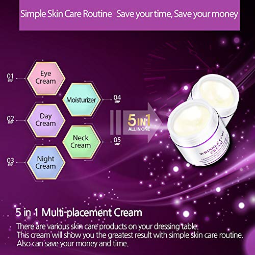 5 in 1 Minimize effort, Maximize effect – There are various skin care products on your dressing table: Eye Cream, Neck Cream, Moisturizer, Day cream, and Night cream. When you purchase this item, you will see the greatest result with simple skin care routine. In addition, you will save your money and time at the same time.