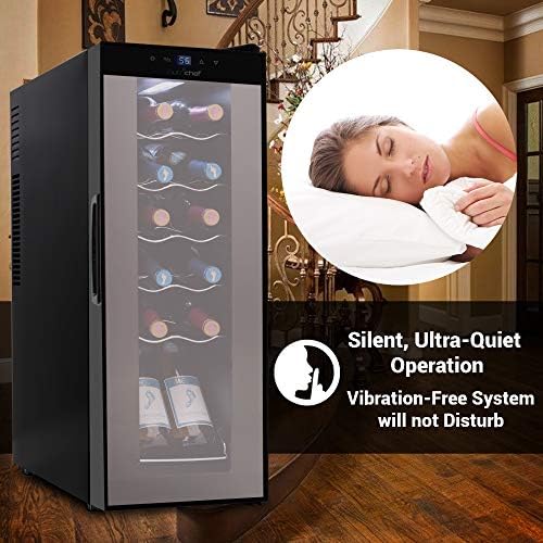 Features: Wine Chilling Refrigerator Cooler Compact Freestanding Wine Cellar Style (12) Wine Bottle Capacity Built-in Compressor Cooling Technology Simple Electric Plug-in Design Adjustable Temperature Settings Digital Soft-Touch Button Control Panel Interior LED Light Illumination Control Silent, Ultra-Quiet Operation Built-in Circulation Fan & Ventilation Grill Reinforced Glass Door with Air-Tight Seal Celsius and Fahrenheit Unit Selectable (°C/°F) Button-Activated Child Safety Auto-Lock Function Integrated Door Handle for a Smooth Front Surface Includes Contoured, Polished Chrome Wine Racks Bottom Tall Shelf for Standing Wine Bottle Storage Free-Standing Design for Floor, Table or Countertop Placement.