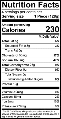 INGREDIENTS: Chicken Breast Fillets (Containing up to 10% Solution of Water, Salt, and Sodium Phosphates), Breading (Enriched Wheat Flour [Enriched with Niacin, Reduced Iron, Thiamine Mononitrate, Riboflavin, Folic Acid], Salt, Yellow Corn Flour, Wheat Gluten, Leavening [Sodium Acid Pyrophosphate, Sodium Bicarbonate, Monocalcium Phosphate], Spices, Cornstarch, Dried Garlic, Modified Cellulose Gum, Dried Onion, Soybean Oil, Paprika, Spice Extractives), Predust and Batter (Water, Enriched Wheat Flour [Enriched with Niacin, Reduced Iron, Thiamine Mononitrate, Riboflavin, Folic Acid], Yellow Corn Flour, Salt, Wheat Gluten, Leavening [Sodium Acid Pyrophosphate, Sodium Bicarbonate, Monocalcium Phosphate], Spices, Dried Onion, Dried Garlic, Cornstarch, Paprika, Extractives of Paprika, Spice Extractives). Breading set in Soybean Oil.