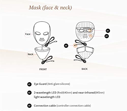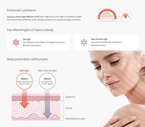 Two wavelengths of OPERA Lebody: 1. RED LIGHT – 630nm (skin elasticity, stimulation of collagen production, wrinkle improvement). 2. NEAR-INFRARED LIGHT – 845nm (wrinkle improvement, melanin care, skin rejuvenation) | Number of LED lights: A total of 228 LED bulbs (Face – 78 x 2, Neck – 36 x 2). Clinically tested to improve skin dullness and darkness, skin roughness, wrinkles and fine lines, skin elasticity, and moisture level and absorption.
