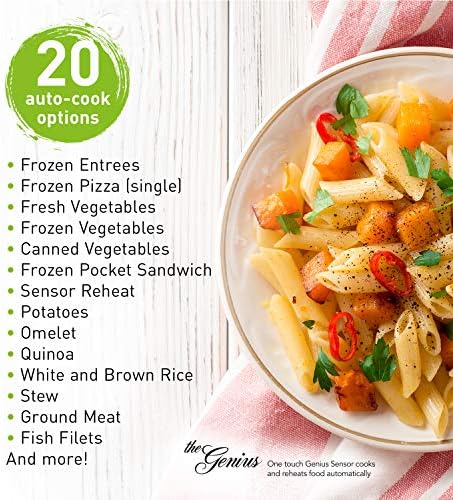 SMART COOKING SETTING: Built-in automatic sensor adjusts power and times based on different foods; other advantages include 20 preset menu items, quick-minute timer, delay start and child safety lock