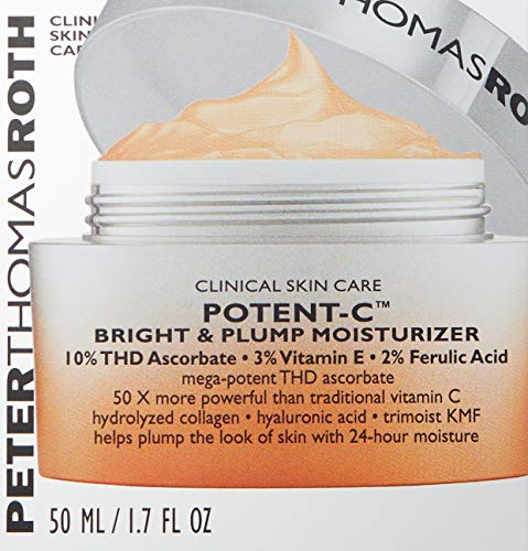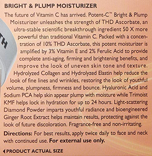 The future of Vitamin C has arrived. Potent-C Bright & Plump Moisturizer unleashes the strength of THD Ascorbate, an ultra-stable scientific breakthrough ingredient 50 X more powerful than traditional Vitamin C. Packed with a concentration of 10% THD Ascorbate, this potent moisturizer is boosted by 3% Vitamin E and 2% Ferulic Acid to provide complete anti-aging, firming and brightening benefits, and improve the look of uneven skin tone and texture. Helps reduce the look of fine lines and wrinkles, restoring the look of youthful volume, plumpness, firmness and bounce with Hydrolyzed Collagen, Hydrolyzed Elastin, Hyaluronic Acid and Sodium PCA. Trimoist KMF helps lock in hydration for up to 24 hours. Light-scattering Diamond powder imparts a youthful, radiant look and bioengineered Ginger Root Extract helps maintain results.