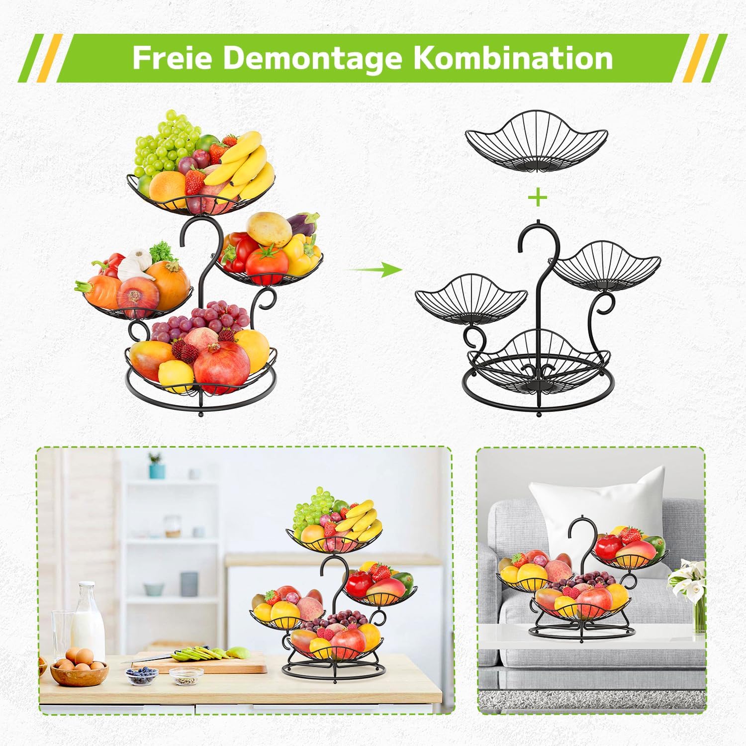 Fruit Basket Set: You can get two fruit baskets, one has 2 hooks for bananas or grapes, and the other is a beautiful 4-tiered lotus leaf-shaped fruit basket that can really jazz up the place